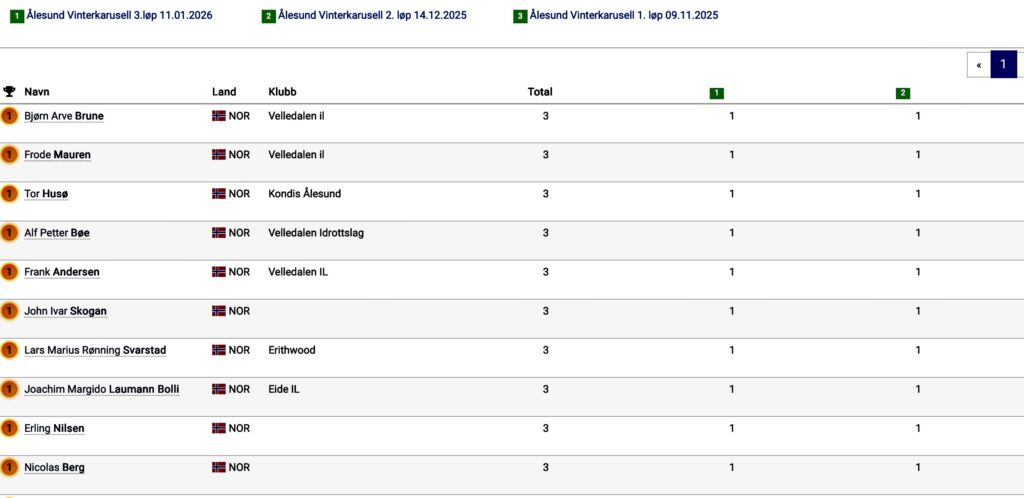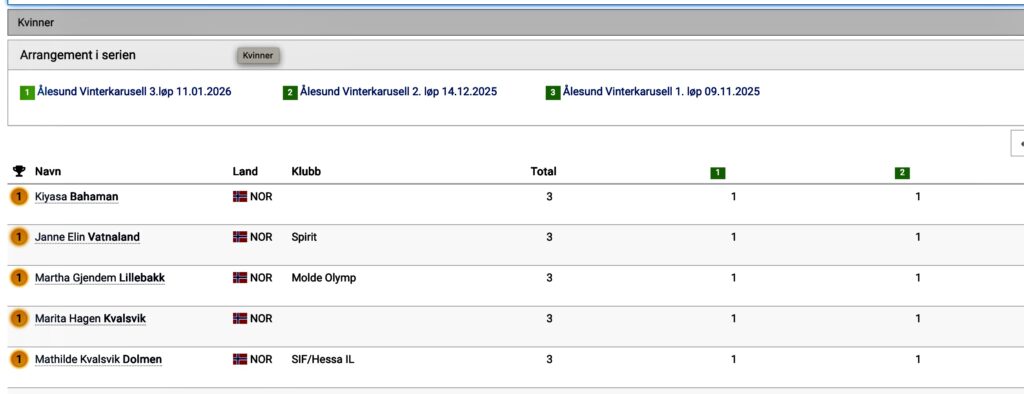 Etter de tre første løpene er 22 løpere kvalifisert til premie. Vi må gå inn i fanen «serier» på resultatlista på eqtimming.no for det siste løpet i Ålesund Vinterkarusell for å studere sammenlagt-stillingen hittil i karusellen.